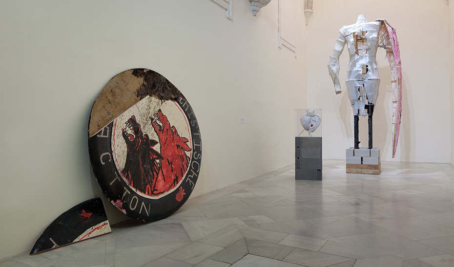 El trabajo de Pablo Capitán del Río (Granada, 1982) y Jacobo Castellano (Jaén, 1976) tienen en común una forma de hacer, de construir, ligados al lenguaje de la escultura y la instalación basada en la exploración del objeto. Las tradiciones populares y el acervo religioso de nuestro país son algunos de los temas a los que Castellano acude con mayor insistencia; esta pieza representa un Paso de Semana Santa, en el que se condensa lo popular y lo sacro, la intensa devoción y la superstición que rodean una forma de venerar las imágenes y las formas de la religión. Por su parte, Capitán del Río también está tomando un elemento de la tradición agrícola popular, las compuertas de regadío, para construir una escultura suspendida a modo de móvil, que posee además una larga tradición artística. Todo el conjunto está equilibrado como un juego de pesos y contrapesos en un solo punto de apoyo, creando un frágil equilibrio, que también es compartido por la escultura de Jacobo Castellano.