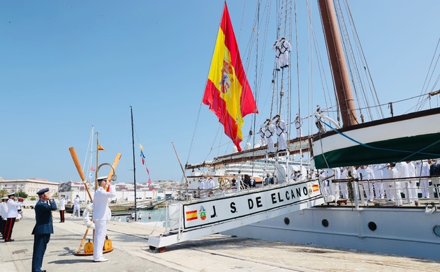 Su Majestad el Rey asistió en cubierta al izado solemne de Bandera, al levantamiento de fondeo e inicio del tránsito a Cádiz y a la posterior maniobra de atraque en puerto del Buque Escuela «Juan Sebastián de Elcano».