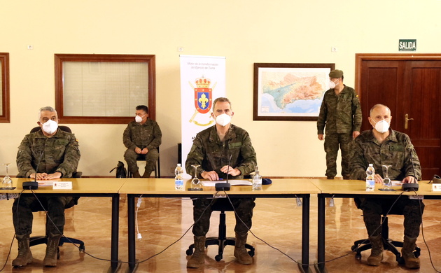 El Rey acompañado por el jefe de Estado Mayor del Ejército, general de ejército Francisco Javier Varela Salas, fue recibido por el jefe del Mando de Adiestramiento y Doctrina, teniente general Jerónimo de Gregorio y Monmeneu. Tras recibir honores a cargo de un piquete militar, Don Felipe asistió en el Salón del Artesonado, cuyos artesonados son de los mejores alfarjes hispanomusulmanes, donde se le han expuesto las funciones y la organización de la Unidad.