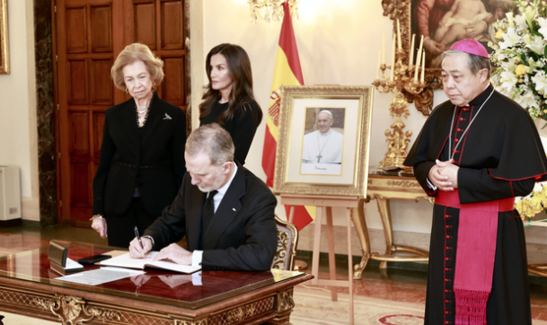 su llegada, fueron recibidos por el Nuncio Apostólico de la Santa Sede en España, Bernardito Auza, quien les dio la bienvenida, seguidamente, los Reyes y Doña Sofía firmaron el libro de condolencias abierto en memoria del Pontífice, dejando constancia de su profundo pesar y reconocimiento a su legado espiritual. La visita refleja el estrecho vínculo entre la Corona española y la Santa Sede, así como el respeto y admiración hacia la figura del Papa Francisco.