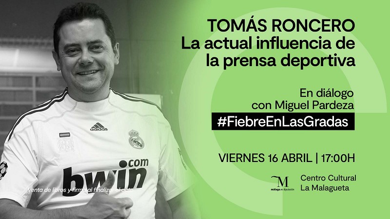 Viernes, 16 de abril. 17:00h. Tomás Roncero. La actual influencia de la prensa deportiva. En dialogo con Miguel Pardeza, Tomás Roncero, conversarán sobre la actual influencia que tienen los medios de comunicación deportivos, alimentada por el crecimiento de las redes sociales y el protagonismo del periodista en la vida diaria de la información. Además de su trabajo en AS, Roncero ha sido comentarista en los espacios de radio El larguero y Carrusel deportivo (ambos en la Cadena SER), El penalti (Onda Cero), El tirachinas (COPE), Punto Pelota (Intereconomía) y El chiringuito de Jugones (Atresmedia).