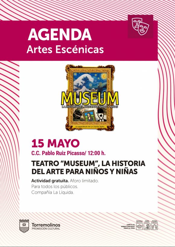 El Centro Cultural Pablo Ruiz Picasso acoge este sábado la obra de teatro ‘Museum’, de la compañía La Líquida. Un espectáculo infantil que recorrerá la Historia del Arte de la mano de los grandes maestros: Picasso, Van Gogh, Velázquez, Miguel Ángel, Da Vinci… y por supuesto de las grandes maestras como Tamara de Lempika, Sofonisba Anguissola o Frida Kahlo. Las puertas se abrirán a las 11:30 horas y el espectáculo empezará a las 12.00 horas con entrada gratuita hasta completar un aforo limitado para mantener las medidas de seguridad.