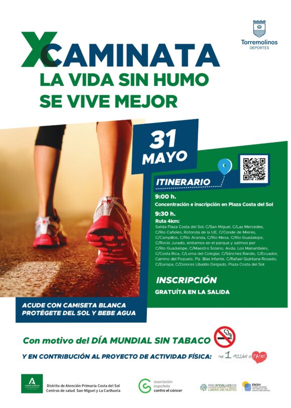 Torremolinos se suma a la celebración del `Día Mundial Sin Tabaco´ el próximo miércoles 31 de mayo con una caminata que impulsan los centros de salud de San Miguel y La Carihuela, una iniciativa que cuenta con la colaboración de la delegación de Deportes del Ayuntamiento de Torremolinos.