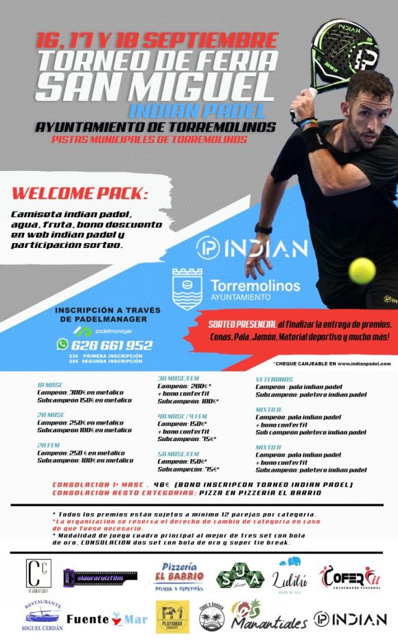 La delegación de Deportes pone en marcha los próximos días 16, 17 y 18 de septiembre, el torneo de la feria de San Miguel Indian Pádel, competición que ya cuenta con su plazo de inscripción abierto y que contará con diferentes categorías e importantes premios en metálico.