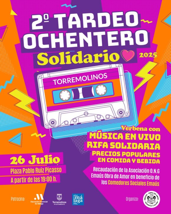 La ONG Emaús Obra de Amor, en colaboración con el Ayuntamiento de Torremolinos y la Diputación de Málaga, organiza por segundo año consecutivo un “tardeo ochentero”, una jornada festiva y solidaria que tendrá lugar este sábado 26 de julio, a partir de las 19:00 horas en la plaza Pablo Ruiz Picasso.
