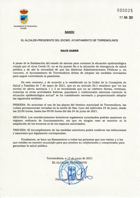 El Ayuntamiento de Torremolinos ha informado, que según el bando emitido por el alcalde del municipio, José Ortiz, las playas de Torremolinos permanecerán cerradas durante la noche de San Juan 2021. Desde las 22.00h del día 23 de junio, y hasta las 09.00h del 24 de junio, no se autorizará el uso de las playas del término municipal de Torremolinos. En este sentido cabe destacar que los establecimientos hosteleros legalmente autorizados podrán mantener su régimen ordinario de funcionamiento, sin que en ningún caso se autorice la ampliación de los horario ni los espacios autorizados.
