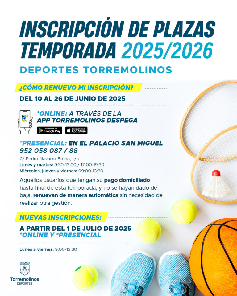 El procedimiento para inscribirse en las diferentes actividades puede hacerse de manera online, a través de la app `Torremolinos Despega´/Inscripciones Deportivas/Servicios Deportivos o de forma presencial en las oficinas del Palacio San Miguel de lunes a viernes, en horario de 9:00 a 13:30 horas.