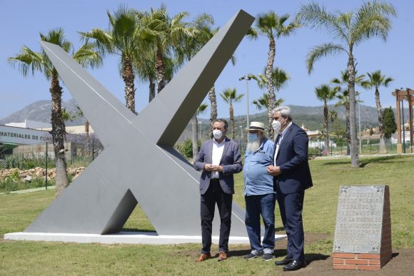 El alcalde de Torremolinos, José Ortiz, el concejal de Servicios Generales para la Ciudadanía, Antonio Navarro, y el artista Paco Jurado, han presentado hoy la nueva rotulación de la escultura conmemorativa del hermanamiento entre Torremolinos y la ciudad inglesa de Stockport, del que este año se cumplen tres décadas y que ya en los jardines situados en camino del Pinillo junto a los huertos urbanos en su nueva ubicación.