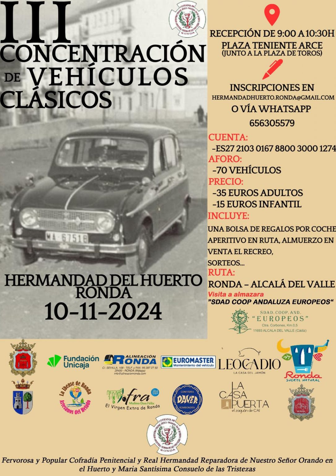 El hermano mayor ha informado que en apenas tres años, esta cita ya es referente para todos los que suelen acudir con sus coches a este tipo de encuentros. Ha agradecido la colaboración de Turismo de Ronda y de la delegación de Tráfico. Los coches estarán en la plaza Teniente Arce el domingo de 09.00 a 10.30 llegando desde numerosos puntos de Andalucía e incluso de otras comunidades como Murcia, resaltando que estos vehículos son, en muchos casos, auténticas joyas. Tras la exposición, se iniciará una ruta hacia Alcalá del Valle, donde habrá varias actividades como la visita a una almazara. Pérez ha agradecido la colaboración de diferentes empresas y ha invitado a todos a que puedan disfrutar de esta actividad.