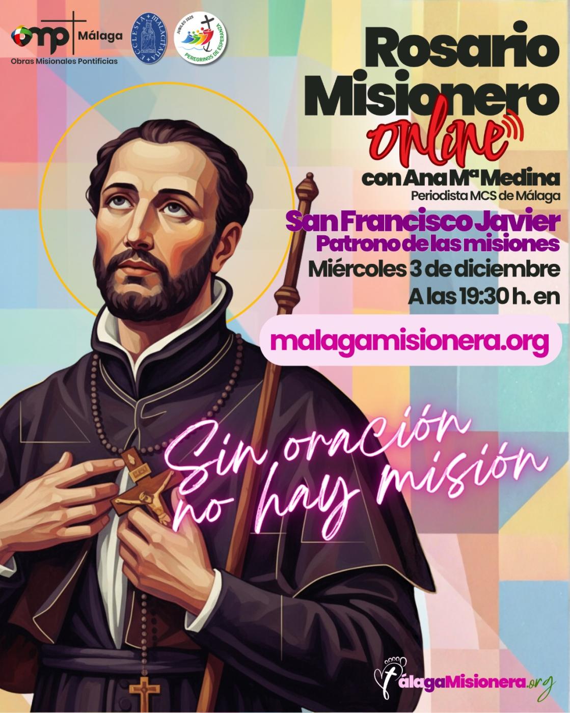 El 3 de diciembre, fiesta de san Francisco Javier, patrón de las misiones, la Delegación Diocesana de Misiones convoca a todos a rezar juntos el Rosario por las intenciones misioneras de la Iglesia y por tantos misioneros y misioneras repartidos por el mundo. La cita es a las 19.30 horas, y podrá seguirse a través de la web malagamisionera.org.