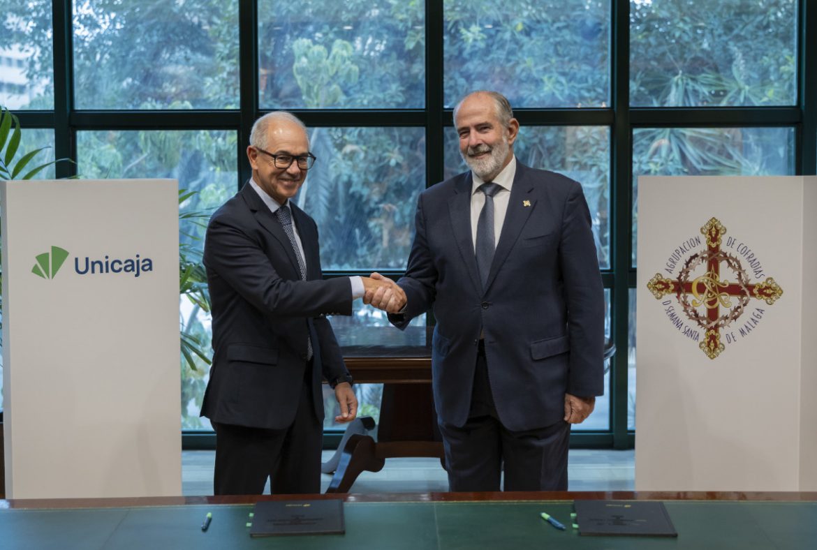 El acuerdo, que viene firmándose desde hace ya 17 años, ha sido suscrito por el CEO de Unicaja, Isidro Rubiales, y el presidente de la Agrupación de Cofradías de Semana Santa de Málaga, José Carlos Garín.