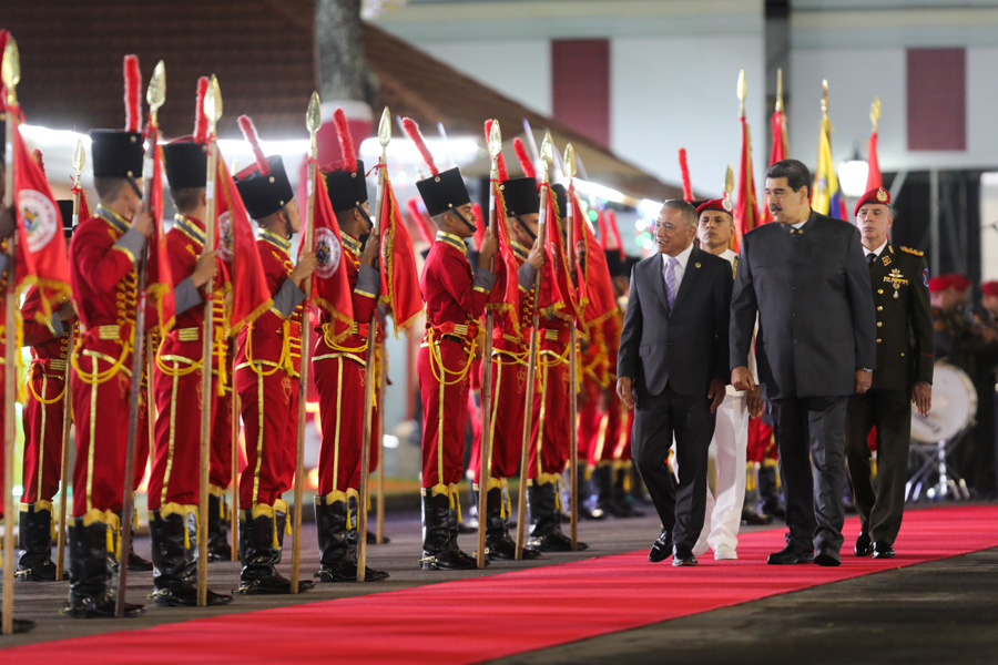 La cordial bienvenida continuó con los saludos de la Vicepresidenta Ejecutiva, Delcy Rodríguez, y miembros del Ejecutivo Nacional, entre ellos, el Canciller, Carlos Faría.